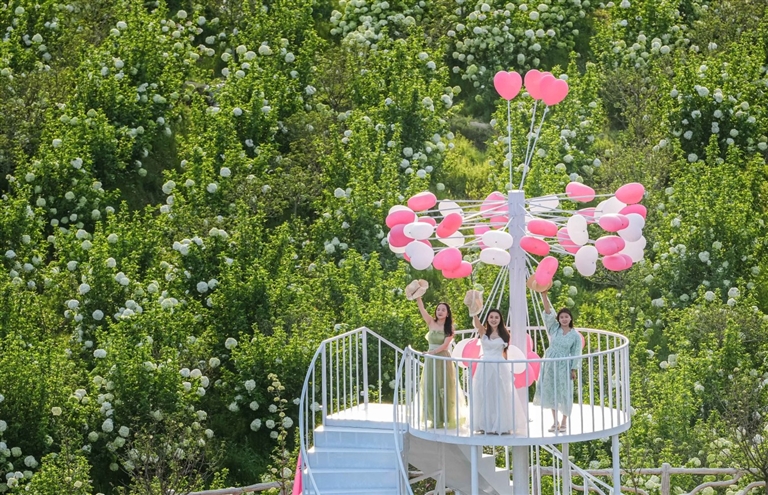 4月2日,位于上饶市广丰区大南镇的千亩中华木绣球正值盛花期,吸引众多游客前往观赏和拍照打卡。 通讯员 饶庆平摄