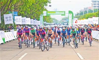 4月7日,2025第十六届环海南岛国际公路自行车赛在海南琼海开赛。在首日琼海-琼海赛段的比赛中,喜德盛阿斯塔纳车队车手马泰奥·马卢切利获得本赛段第一名。图为参赛车手在比赛中。新华社记者 杨冠宇摄