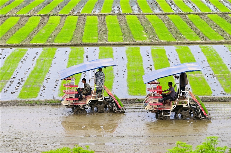 4月7日,万载县双桥镇垞上村,农民驾驶农机在田间机插早稻。