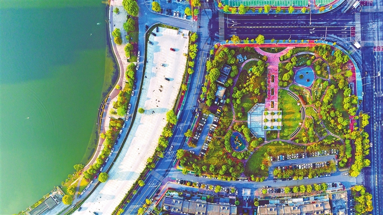 4月6日,俯瞰新余市沿江路一处“口袋公园”美丽如画,为市民提供了休闲好去处。