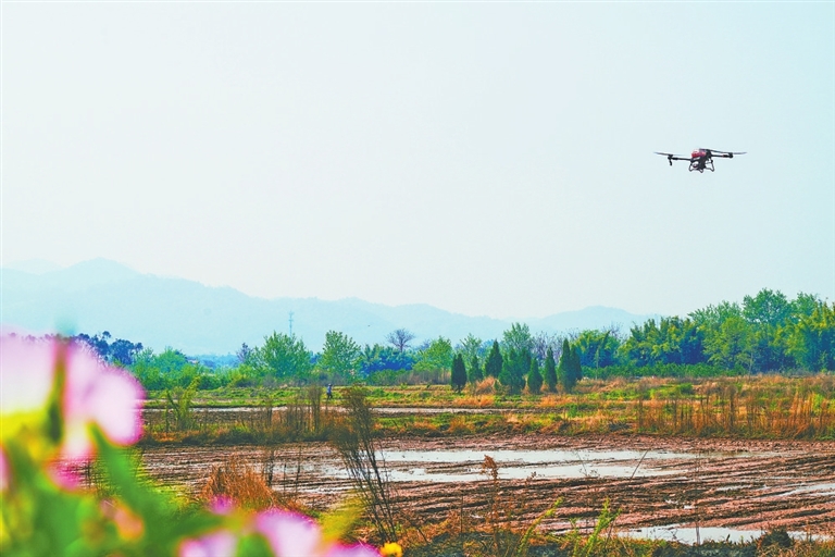 春耕时节,龙南市渡江镇竹梓村水稻种植基地一片繁忙,种植户利用晴好天气开展无人机飞播作业,科技助力春耕,绘就生动的“春耕科技图”。 本报全媒体记者 蔡颖辉摄