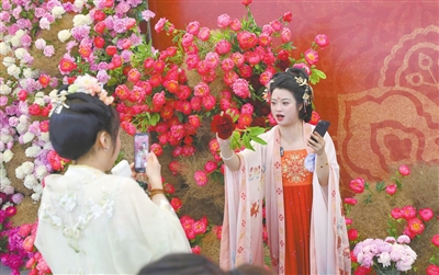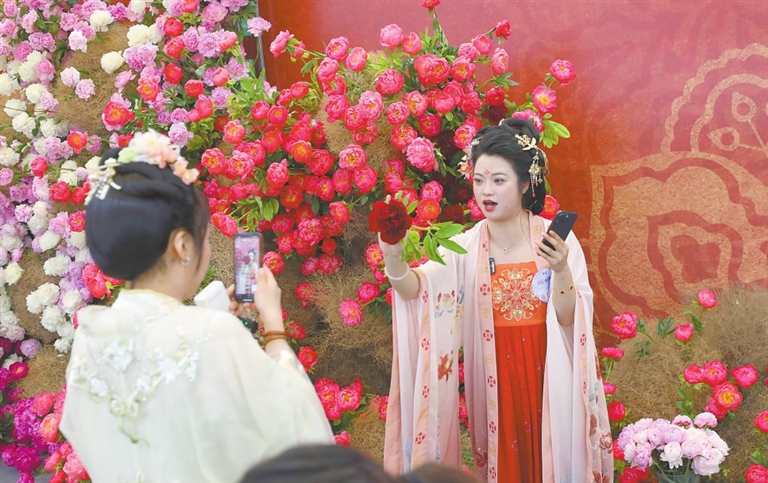 4月10日,工作人员身着传统服饰进行花卉销售网络直播。