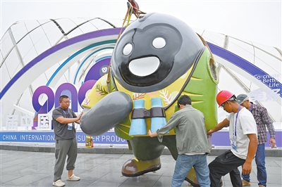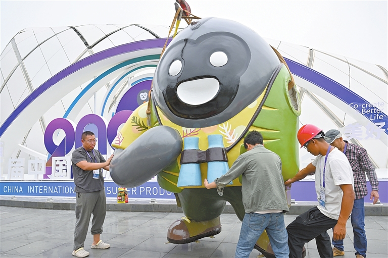 4月10日,工作人员在摆放消博会吉祥物。