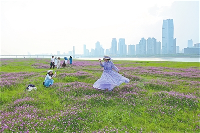 4月9日,南昌市赣江裘家洲,大面积的紫云英开放,吸引了不少游客前来赏花、拍照。本报全媒体记者 洪子波摄