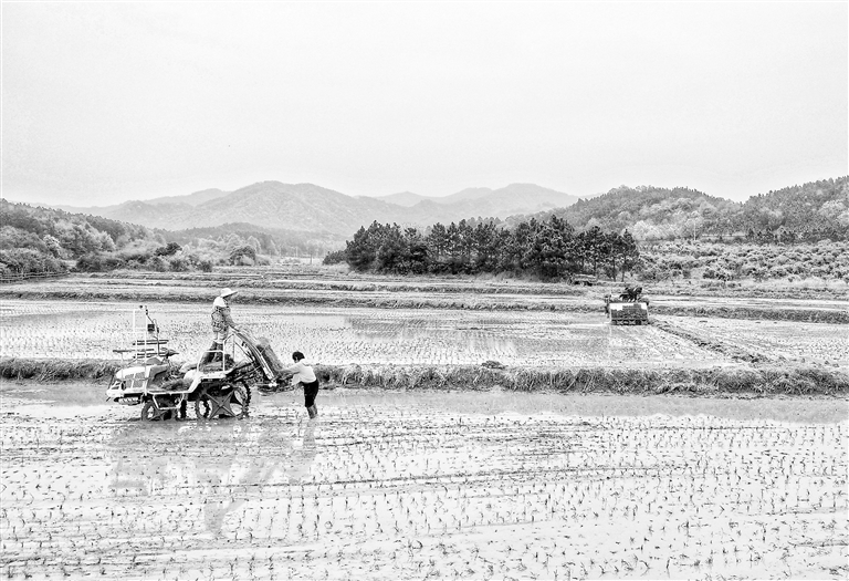 峡江县积极推动农业机械化种植,提高农事生产效率。图为4月9日,马埠镇上盖村村民驾驶插秧机在水田作业。本报全媒体记者 徐 铮摄