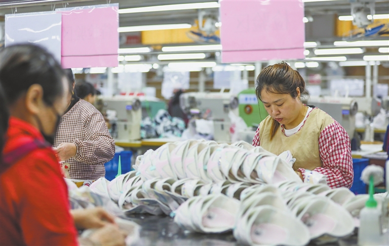 萍乡市湘东区引进劳动密集型、手工加工型企业,让当地群众和返乡农民实现家门口就业。图为4月8日,麻山镇的一家鞋业生产车间,工人在赶制产品订单。通讯员 彭 亮摄