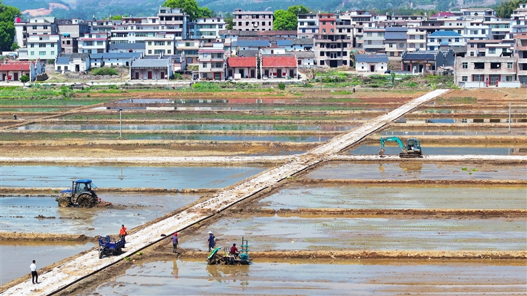 ▲ 当前正值早稻插秧黄金时节,宁都县各地种粮大户全面开展春耕生产,田间地头呈现出一派农忙景象。图为青塘镇青塘村,农户驾驶插种机机插早稻秧苗。本报全媒体记者 杨文斌摄