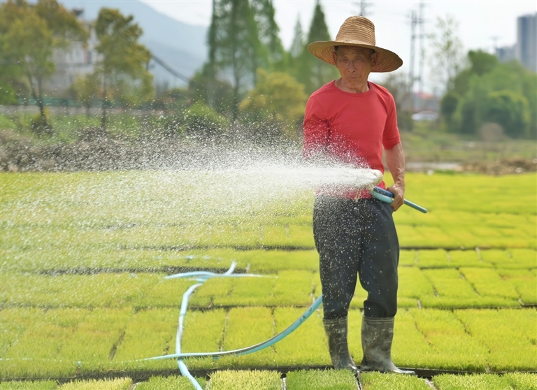 ▶ 春耕备耕正当时,在芦溪县芦溪镇高楼村育秧基地,工人正在为秧苗浇水保湿。本报全媒体记者 刘启红摄