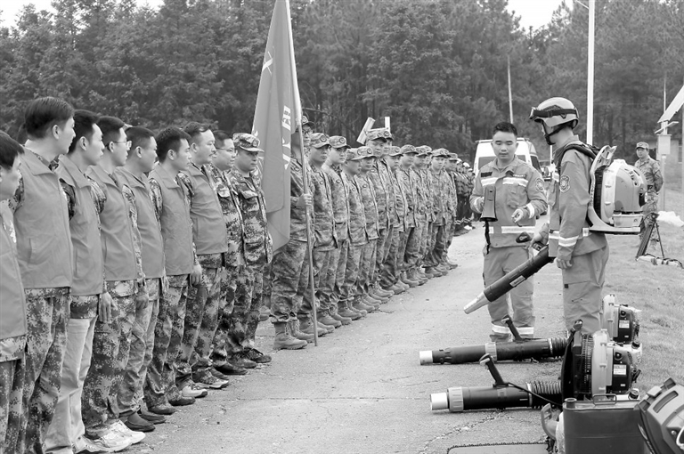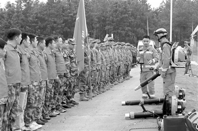 近日,永丰县各乡镇组织开展森林防灭火应急演练。图为4月10日,在恩江镇洋陂坑村林区,森林消防员向民兵讲解灭火器材使用知识。通讯员 刘浩军摄