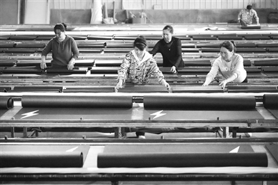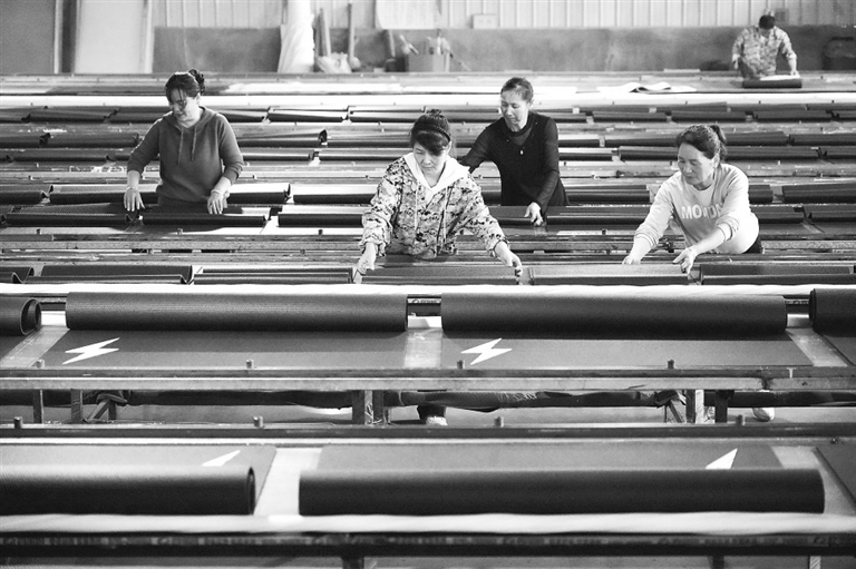 4月10日,上高县伟群塑胶有限公司生产车间,工人们正在赶制瑜伽垫,满足市场需求。通讯员 邹利强摄