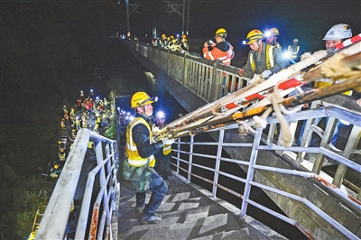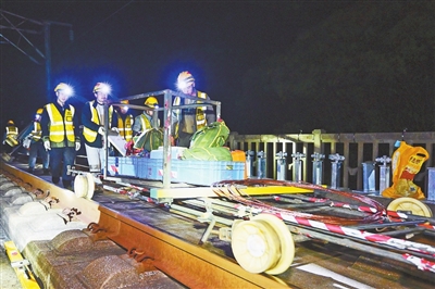 “请大家带好工具,可以上去了!”4月1日23时40分,随着线路封锁命令下达,工人们扛着工具、抬着梯车,分成33个小组,有序穿越栅栏门,到达高铁线路上。