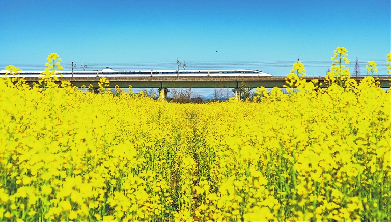 新余市仙女湖区观巢镇境内,列车飞驶在春日的花海之中。 特约通讯员赵春亮摄