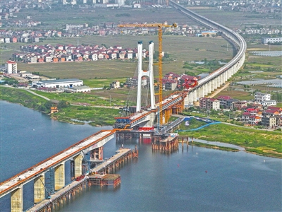 目前,昌九高铁全线已施工标段共完成投资计划的77%,全线预计2027年3月具备开通运营条件。图为4月14日,昌九高铁南昌扬子洲赣江公铁大桥南支,建设人员正加快施工进度。本报全媒体首席记者 李 劼摄