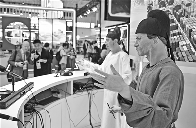 ①4月13日在消博会上拍摄的身着古装的仿生人形机器人。