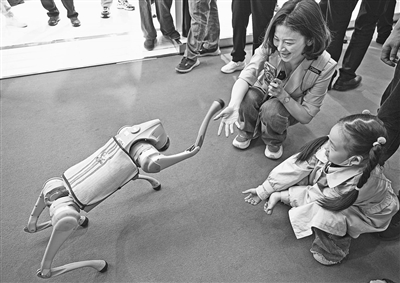 ②4月14日,观众在第五届消博会宇树科技展台与机器狗握手。