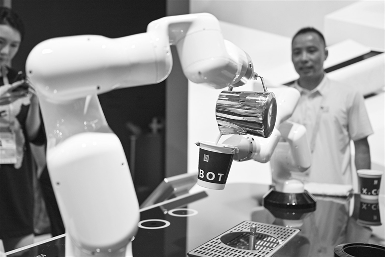 ③4月13日,消博会上展示的一款机器人在制作拉花咖啡。