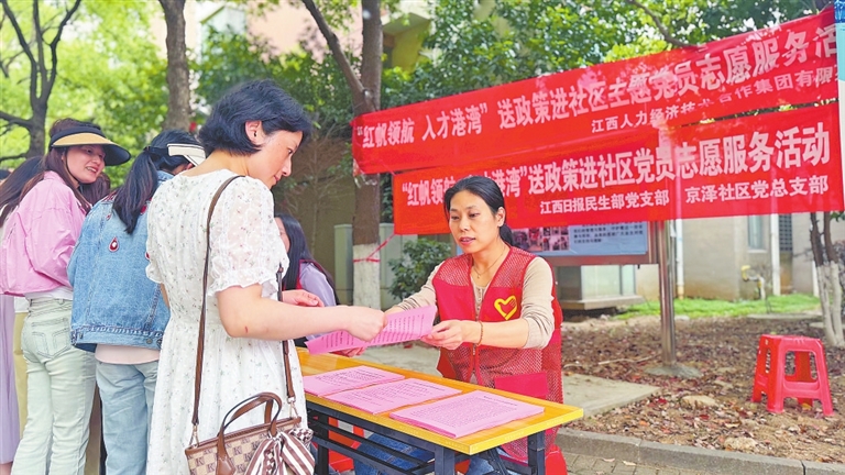 本报南昌讯 (全媒体记者陈璋)4月11日,本报民生部党支部联合南昌市青山湖区京东镇京泽社区党总支、江西人力经济技术合作集团有限公司,共同开展“红帆领航、人才港湾”送政策进社区主题党日活动,将社保、公积金、劳动者权益保障及求职面试指导等实用政策送到居民身边。
