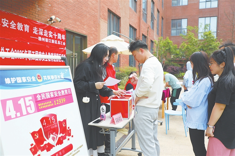 增强广大职工群众国家安全意识和素养,筑牢国家安全人民防线,近日,在第十个全民国家安全教育日来临之际,赣州蓉江新区在数字产业园举办国家安全教育进园区活动,通过“法治宣传+趣味互动+精准服务”的沉浸式普法方式,将国家安全教育融入职工生产生活场景。