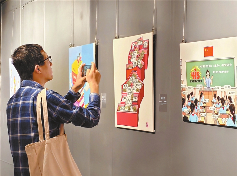 4月15日,宜春市民在宜春美术馆参观“全民国家安全教育日”十周年全国主题漫画大赛作品展。