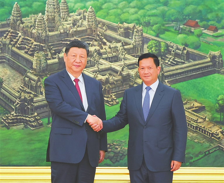 习近平指出,中柬友好跨越千年,两国人民始终双向奔赴、相互成就。无论国际风云如何变化,中柬两国坚守信义、守望相助,在涉及彼此核心利益和重大关切问题上始终坚定相互支持,树立了大小国家平等相待、真诚互信、互利共赢的典范。中柬两国始终走在构建人类命运共同体前列,给柬埔寨民众带来实实在在的好处。