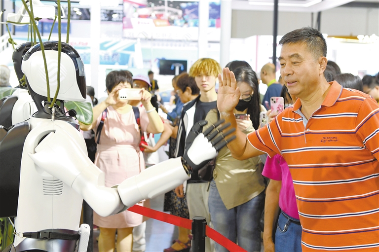 4月17日,观众在消博会中国移动展台与机器人击掌互动。