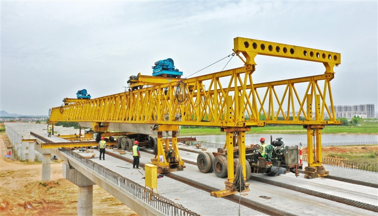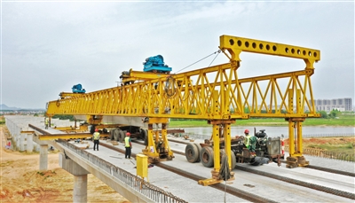 4月16日,永丰县恩江镇岭上村恩江公路大桥建设现场,工人正在紧张施工。