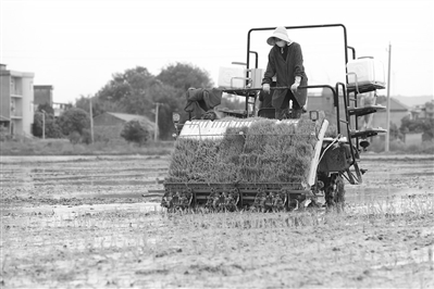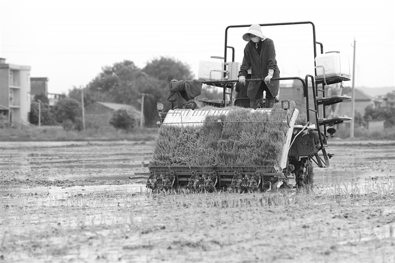 4月16日,在余干县梅港乡赤岭村,农机手驾驶插秧机栽插早稻秧苗。陈若薇摄