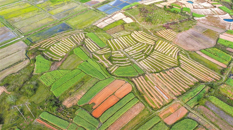4月15日,航拍下的高安市独城镇安塘村春意盎然,阡陌交错的田垄色彩斑斓,宛如大地调色板。通讯员 胡可欣摄