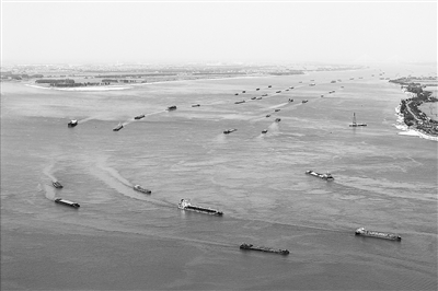 4月18日,货船在长江彭泽段航道上有序航行,一派繁忙景象。