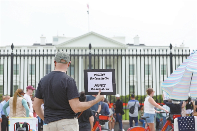美国多地19日举行抗议活动,首都华盛顿、纽约、旧金山、波士顿等城市的民众走上街头,抗议现政府大规模裁员、加征关税、驱逐移民等政策。 新华社记者 胡友松摄