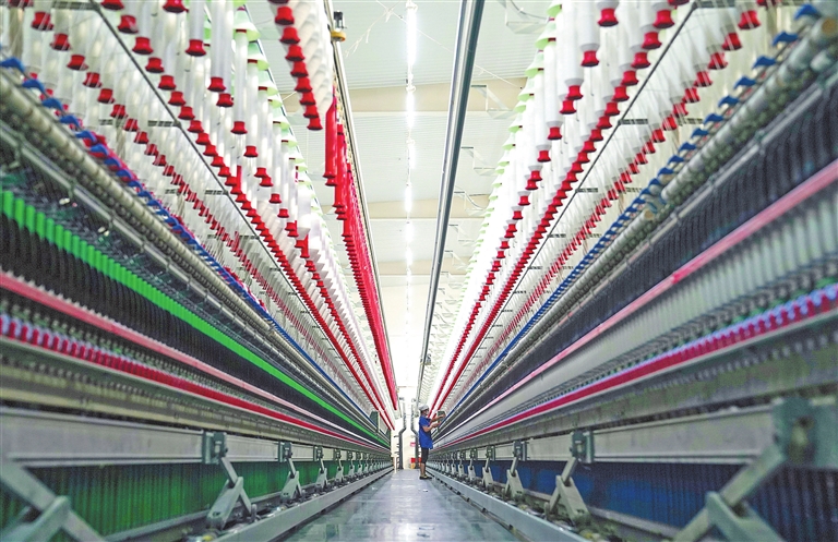 4月21日,位于新余经济开发区的江西万达美纺织科技股份有限公司生产车间内,纺织工人在生产线上巡检设备。据了解,该公司通过建设“5G+智慧工厂”,产品竞争力进一步增强,畅销国内外市场。特约通讯员 凌厚祥摄