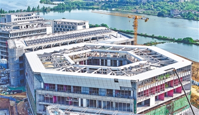 南昌瑶湖科学岛一期项目主体结构和室内二次结构施工已完成,预计今年6月竣工交付。图为4月18日,中建三局施工人员在南昌瑶湖科学岛外墙吊篮上进行幕墙施工。本报全媒体记者 张翰林摄