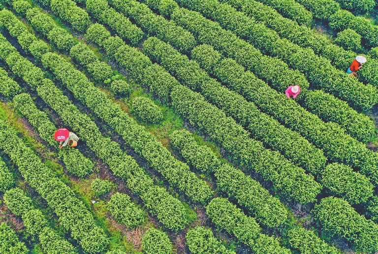 近年来,峡江县水边镇大力发展茶产业,促进茶旅融合。图为近日,茶农在该镇寒梅岭茶园采摘嫩茶叶。本报全媒体记者 徐 铮摄