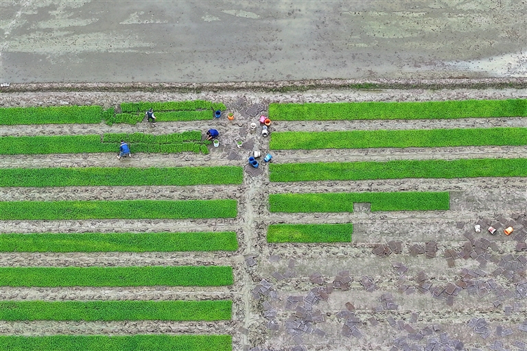4月19日,宜丰县黄垦镇岗南村,农户在早稻田间起秧,准备春插。