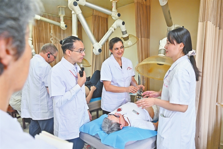 4月23日,在江西中医药大学附属医院西湖院区,6名前来进修的法国“洋中医”,在热敏灸治疗室、灸疗推广国家基地体验热敏灸特色疗法。