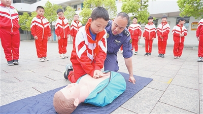 日前,兴国县关工委、曙光救援队联合兴国县第三小学开展了防溺水安全知识进校园活动。图为兴国县曙光救援队队员正在指导该校四年级学生进行心肺复苏法演练。林 剑摄