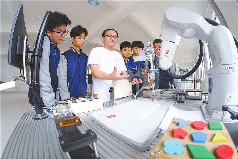 4月24日,在会昌中等专业学校实训中心,同学们在老师的指导下学习工业机器人编程。近年来,会昌县推行“校企合作”“定向培养”等教育模式,为企业打造“来即上岗”的专业技能型人才。