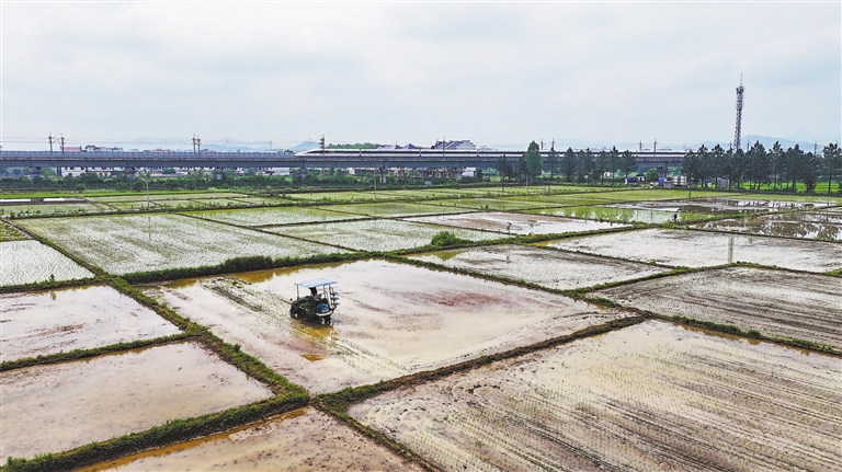 4月23日,吉水县八都镇毛家村示范田,农技人员驾驶搭载侧深施肥装置的新型插秧机栽插早稻秧苗。特约通讯员 廖 敏摄