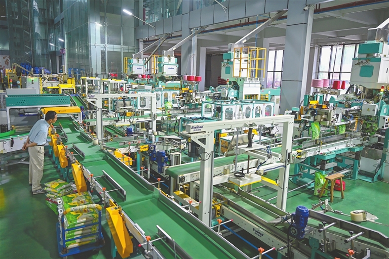万年贡集团有限公司充分发挥世界稻作文化起源地的资源优势,延伸产业链条,强化品牌建设。图为4月22日,该公司生产车间内,一袋袋大米不断地从自动包装机上下线。本报全媒体记者 洪子波摄