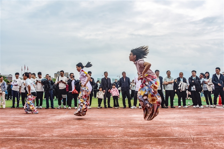 4月26日,遂川县举办第二届职工趣味运动会,乡镇、新业态群体等76支代表队参赛。图为参赛选手在进行袋鼠跳比赛。