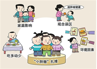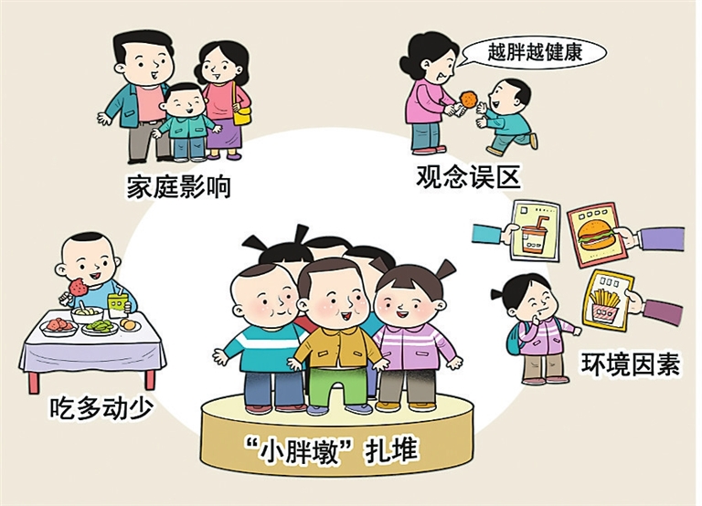 近年来,我国青少年儿童超重肥胖比例持续上升。超重肥胖,不仅影响孩子身体健康,还可能带来焦虑、抑郁等心理问题。“吃多动少”的不良生活习惯,家庭成员“喜欢吃高盐高糖类食物”的饮食习惯,“要多吃、吃得好、越胖越健康”的错误观念,各类零食层出不穷等因素均是“小胖墩”扎堆的重要原因。对此,家庭、学校、社会需要协同配合,构建涵盖食品监管、教育引导、膳食指导的系统体系,助力孩子们健康成长。尤其是家长需要及早干预,少给孩子吃高热量食品,多带孩子参加户外活动,如果肥胖问题比较严重,还应带孩子及时就医。