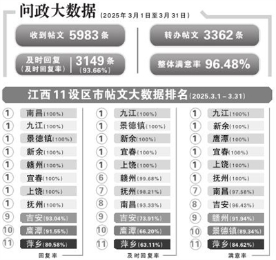 本报讯 (大江网全媒体记者涂文华、信息日报全媒体记者陈志燕)4月29日,大江网《问政江西》栏目组2025年3月问政大数据新鲜出炉。数据显示,3月1日至3月31日,栏目组共收到群众投诉建议帖文5983条,其中3362条帖文证据相对充足、内容详实,已转到各职能部门办理。本期共收到3320条回复,其中及时回复3149条,及时回复率93.66%,整体满意率96.48%。九江新余宜春上饶表现亮眼,及时回复率和满意率均为100%。