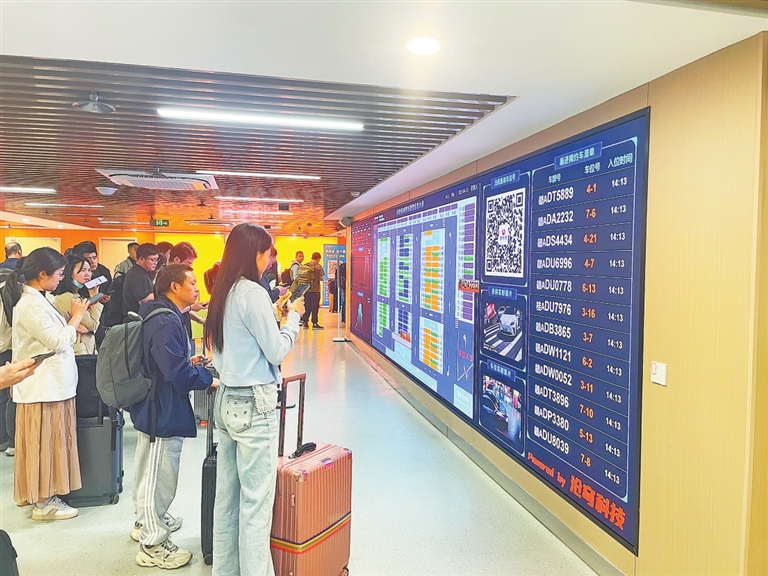 据悉,网约车服务区通过车位相机与智慧管理系统联动,接单车辆进场后,车位相机会自动捕捉并精准识别车辆信息,随后将车牌号、车位号等关键信息实时传输至候车区的电子大屏展示。除了电子大屏,旅客还可通过车位查询机、微信支付宝扫码小程序、支付宝“碰一下”等多种交互方式获取网约车精确定位。