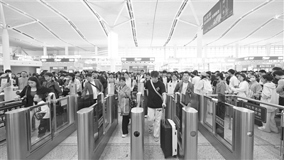 “五一”假期,南昌火车站预计发送旅客180.7万人次,同比增长8.6%。其中,南昌西站预计发送旅客93.6万人次。图为4月30日,南昌西站候车大厅内,旅客在检票口有序进站。