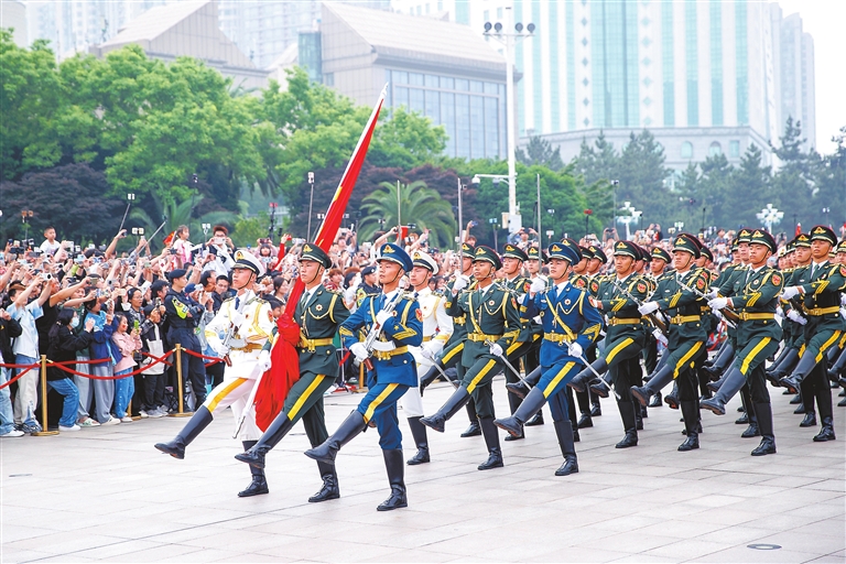 5月1日,南昌市在八一广场举行“弘扬爱国志 奋进新征程”五一升旗仪式,现场数千群众齐唱国歌,表达对祖国的热爱。本报全媒体记者 吴福清摄