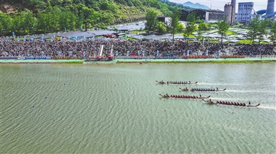 5月1日,分宜电厂螺蛳小镇热闹非凡,袁河水域上,来自新余、宜春、萍乡的8支龙舟队激烈竞逐。图为赛事精彩瞬间。