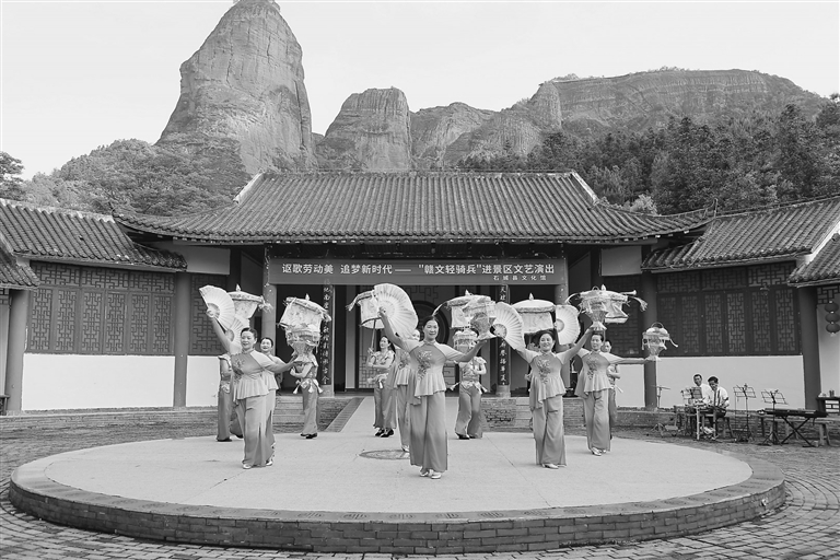 5月1日,石城县琴江镇大畲村古戏台石城灯彩等节目,吸引游客驻足观看。 刘新权摄
