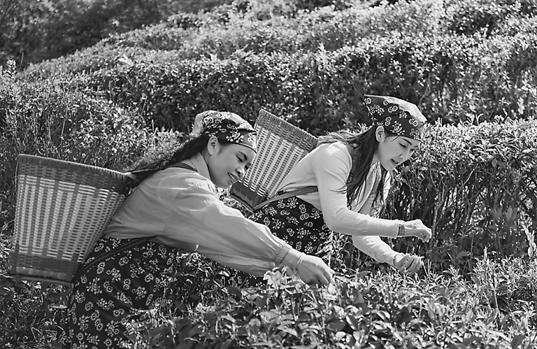 5月2日,奉新县东风垦殖场古迹茶场,茶农们背着茶篓穿梭在茶垄间,采摘春茶,供应市场。 通讯员 官吉普摄