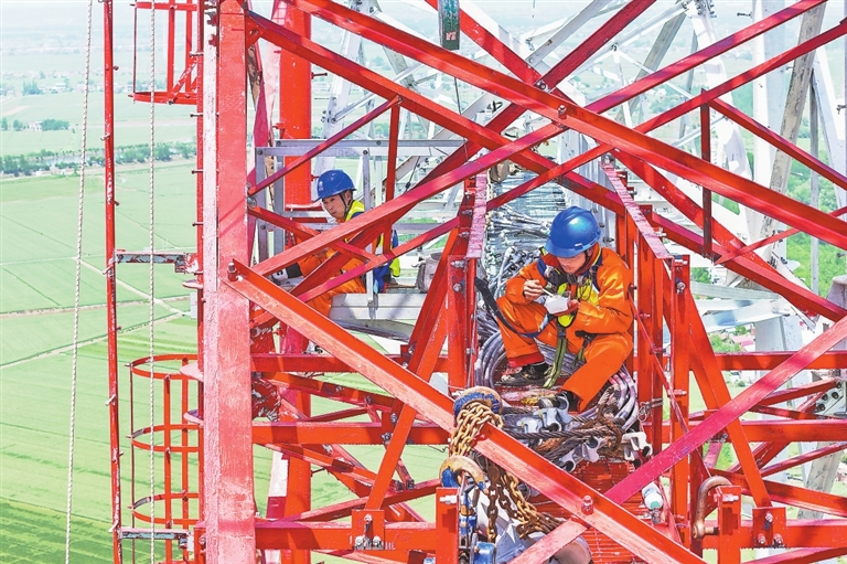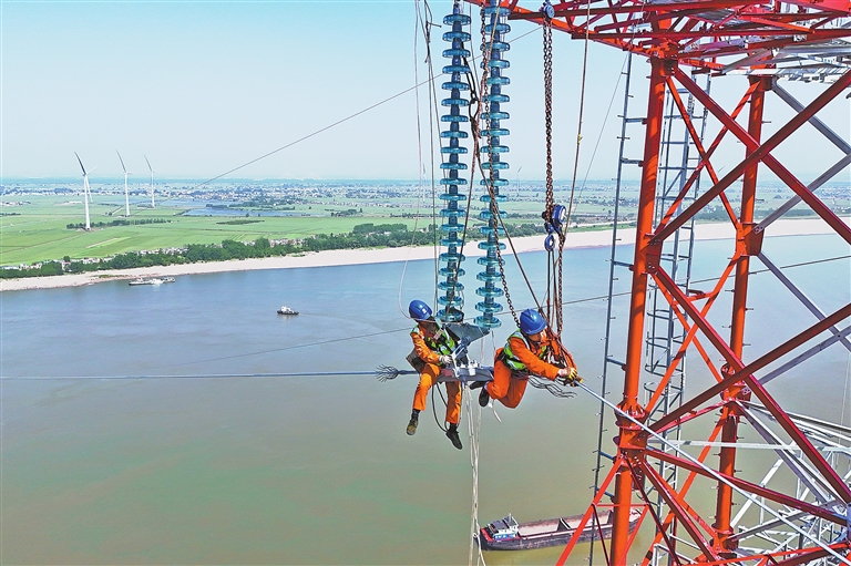 4月18日,在彭泽县棉船镇,大片大片的麦田在江风的吹拂下,荡起层层叠叠的绿色麦浪。其境内的省重点工程——彭泽县棉船风电项目迎来重大建设里程碑——110千伏配套线路正式启动跨长江放线作业。万里长江之上,江西送变电中建公司的工作人员登上172.8米高的铁塔精准“穿针引线”,架设导线。