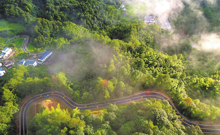 晨光初透,贵溪市樟坪畲族乡民族团结大道上车来车往,玉带般的公路在秀丽的山色中蜿蜒伸展。